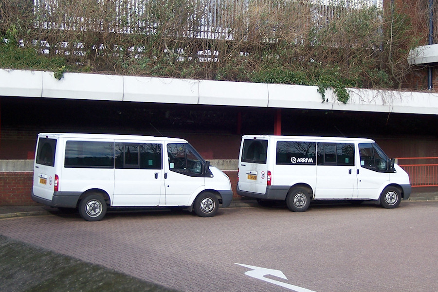 | Details: I recently pondered how long Arriva Southern Counties could keep their rather tired-looking former London taxis going. Well, from February 2014 they started to be replaced by Ford Tourneo minibuses. The change is said to be due to forthcoming emissions legislation changes. The minibuses were transferred from the Heathrow operations of TGM, and retained plain white livery. Photographed at Eltham Bus Station on 9th February 2014 were LT56JXU (left) and LT56JYN (right). | |||||