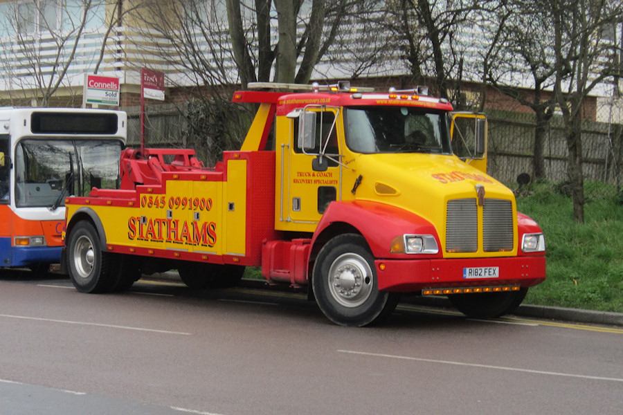 | Details: American-built trucks are very rare in the UK, with a handful of recovery vehicles being the most visible. Adding to the list of makes represented on LTSV, here is Kenworth T300 R182FEX of Stathams Recovery of Dunstable. It was seen preparing to tow a Centrebus Dennis Dart at St Albans Station on 17th February 2014. Although it has the name Harry near the door, the Stathams website states that it is normally referred to as Noddy, for fairly obvious reasons. | ||