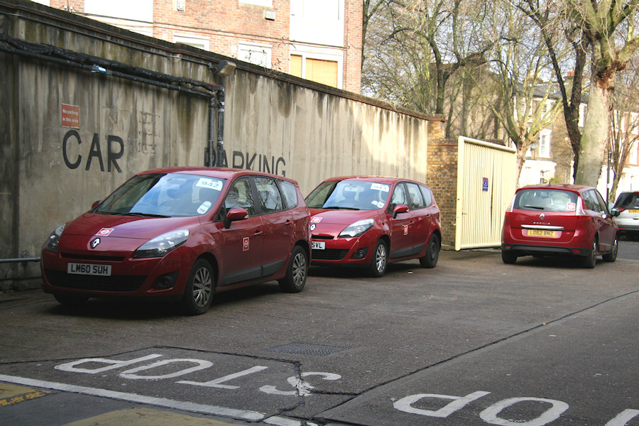 | Details: Metroline's standardisation on the Renault Grand Scenic car for crew ferry duties was shown by the delivery of at least four more examples over the turn of 2013/2014. These included 2 more for Holloway Garage. Derek visited there on 17th December 2013 and found three earlier examples parked in the garage entrance. All have been shown on LTSV before but I have included this photo to highlight the numbers now carried in the windscreens. Are these fleetnumbers or duty numbers? | ||||||