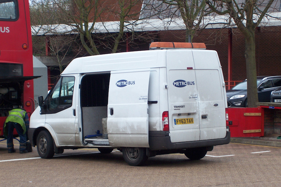 | Details: Numerically the middle of three new Ford Transit vans added to Metrobus stock in early 2014 is Orpington's 9106 (FY63TAV). It was photographed at Eltham Bus Station on 10th February 2014. As I have mentioned before, the short-wheelbase Ford Transit van features cargo doors the same height as the front doors, as highlighted here. Notably this van has a plain white rear, while the one at Crawley has red chevrons. The condition of the Croydon van is not yet known. Whilst similar new vans for 'red' garages have had low-profile lightbars, Metrobus has chosen to continue using traditional ones. | ||||