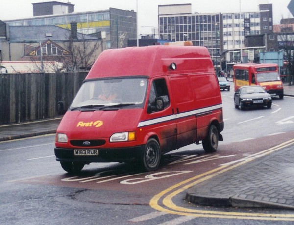 | Details: The First bus operations in East London have had a colourful history, being known as Ensignbus and Capital Citybus in earlier incarnations. Now the vehicles just carry the branding of the parent, as seen on this Ford Transit van (M183RUR) at Ilford on 13th December 2001. A High-Roof example, it carries reflective striping and a spotlight for use when attending bus breakdowns at night. | |||
