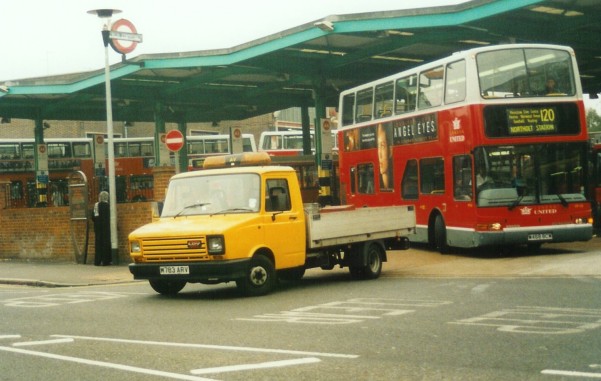 | Details: Identification of service vehicles is made harder when companies choose not to paint or letter them prominently. This LDV 400 dropside (M783ARV) was caught leaving Hounslow bus station/garage on 26th August 2001, and may have been dismissed as a contractor's vehicle but for two points. Firstly, the letters AV on the light bar form the code used by London Transport for Hounslow garage. Secondly, a sister vehicle complete with lettering has also been photographed. | ||||
