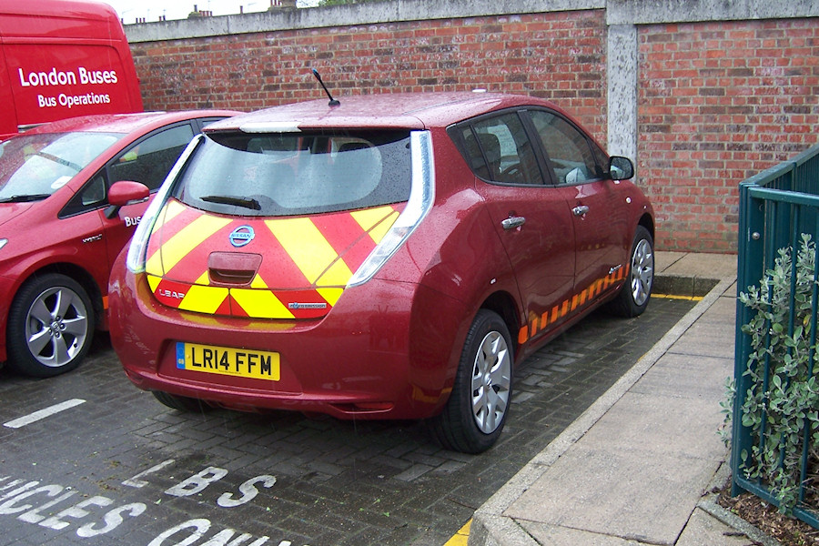 | Details: An unexpected addition at Turnpike Lane from March 2014 was this Nissan Leaf electric car, rather similar to LUL's 7711N. This carried the darker red as seen on the LBSL Toyota Prius cars (such as LN61ZGR parked alongside) and also had the orange squares and rear chevrons, but so far lacked other lettering. One thing it did have though is a fleetnumber (7762N), which is slightly unusual in that cars used by LBSL in recent years have tended to be un-numbered. Photographed on 7th April 2014. | ||||