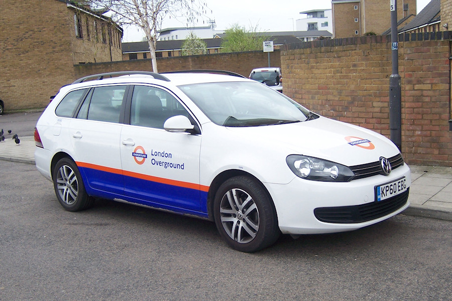 | Details: London Overground's Volkswagen Golf estate KP60EBG has been illustrated before, but this day-time shot shows off the white/blue/orange livery more clearly. The same livery is now of course worn by several other service vehicles. On 4th April 2014 the car was found parked on Oldfield Grove, Surrey Quays, close to the new depot at Silwood Triangle. Note that the blue skirt appears to have been applied using vinyls, which have peeled off somewhat at the bottom. | |||
