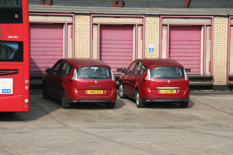 | Details: Metroline's West Perivale Garage is about 100 yards away from the company's CELF (Central Engineering and Logistics Facility). As this photograph taken on 2nd April 2014 shows, the building was originally a goods distribution centre, with high-level loading bays. Two of the three Renault Grand Scenic cars based here were present, both wearing the slightly darker red livery, with the Metroline name on the bonnets only. | |||||