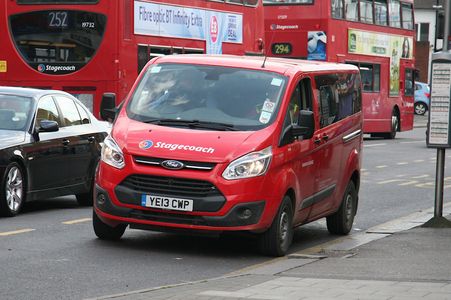 | Details: Five new Ford Transit Custom minibuses were reported working from Stagecoach London's Rainham Garage from autumn 2013, with fleetnumber 90900 apparently missed. As Derek's photo taken at Romford Station on 30th April 2014 shows, the number was actually used, with the full allocation now seeming to be 6 such vehicles (90898-90903). Similar 90897 has been seen working from West Ham. Although the van version of the Transit Custom is now a common sight on UK roads, none have yet been reported in use as service vehicles. | |||