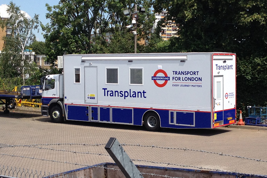 | Details: It's nice when something really unexpected turns up, and this was a good example. Seen in the lorry yard at Acton Works on 22nd June 2014, this vehicle is Mercedes-Benz Axor lorry WX08KUY. Delivered in June 2008 as a dropside lorry, it had recently been refitted with an unusual box body. The windows and access doors suggest it is a mobile office, perhaps to replace demountable body DB8. As well as the new LUL 'Every Journey Matters' lettering, it also sports a huge Transplant fleetname. This is the first heavy lorry to be given the red-stripe livery. Beyond is trailer T66, while behind that is what appears to be a cable-drum carrying trailer, rather like SEBT42 and SEBT43. | ||||