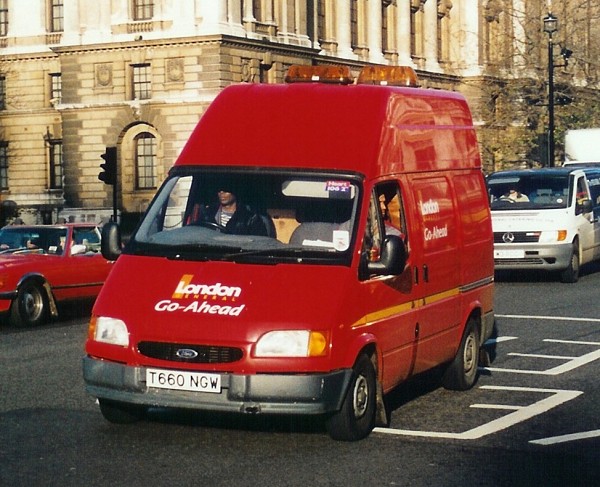 | Details: The high-roof Ford Transit van was popular as an engineering support vehicle with the bus companies. London General T660NGW was unusual for being a shorter-wheelbase model than most. Pictured at Parliament Square on 4th December 2001. | |||