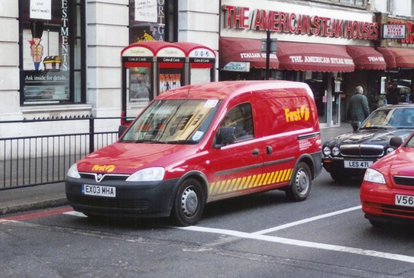 | Details: This smart Vauxhall Combo van was photographed at Victoria in late 2003 in use by First. | |||