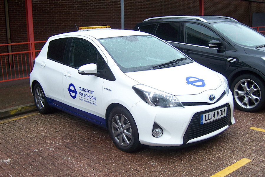 | Details: The role of the new Toyota Yaris hybrid cars in TfL livery was soon discovered when LL14VOH was found parked at Eltham Bus Station on 11th July 2014. It had evidently replaced Toyota Prius KV60KTF for use by the Public Carriage Office. The earlier cars wore unmarked white (although initially had 'Taxi - Private Hire' roundels), while the replacements have TfL lettering and light-bars. Note the relatively rare use of a plain, single-colour roundel. Similar LL14VOK was later reported at Wembley Park Station, replacing Prius KN60XUV. | ||||
