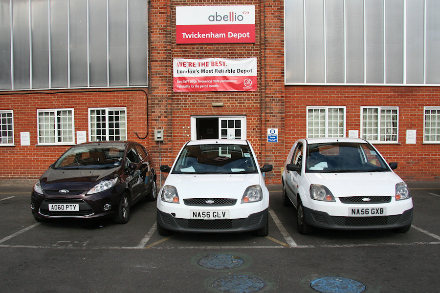 | Details: The eastern end of the erstwhile Fulwell Trolleybus depot is now operated by Abellio and, rather confusingly, is named Twickenham Depot. London Transport had its own Twickenham Garage until 1970, while since 2005 the name has also applied to a garage used by NCP/NSL and later London United. Anyway, parked at what I refer to as 'Fulwell (Twickenham)' on 28th June 2014 were three Ford Fiesta service vehicles. Brown car AO60PTY on the left was a recent addition and carried fleetnumber 6771. The two white vans on the right were both acquired in late 2009 and initially worked from Hayes Garage. Allocated fleetnumbers 6104 and 6105, these were not carried. | ||||||