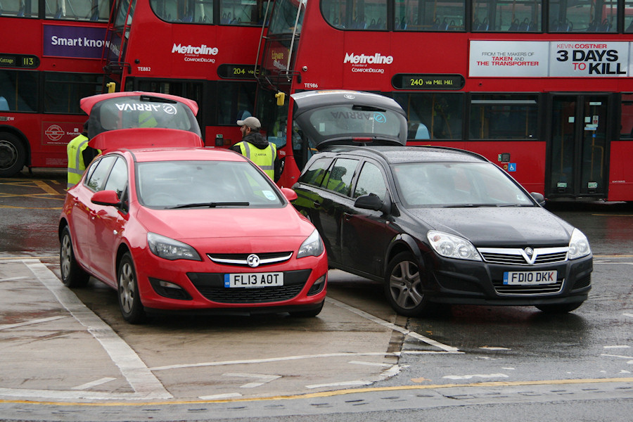 | Details: With their open tailgates showing the only evidence of their nature, these two cars photographed at Edgware Bus Station on 4th June 2014 are used by Arriva the Shires from their Garston Garage. Red hatchback FL13AOT on the left was one of six delivered new in April 2013 to replace an equal number of Citroen Berlingo vans. Black estate FD10DKK on the right was acquired at about the same time. | |||||