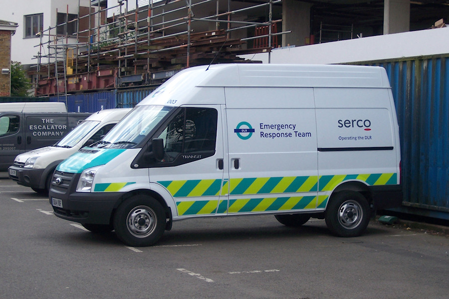 | Details: Service vehicles used in support of the Docklands Light Railway (DLR) have appeared on LTSV before, but not for many years. From the systems opening in 1987, such vehicles were provided by Distribution Services as part of the main leased fleet. From 1992 the management of the line was passed from London Regional Transport to the London Docklands Development Corporation, while in 1997 a concession for the operation was awarded to Serco Docklands Limited. Although the infrastructure is now owned by a subsidiary of TfL, the concession is still in place, and is due to pass to Keolis/Amey in December 2014. Very little is known of support vehicles used between 1992 and 2014 but then a member reported a few sightings and these were subsequently added to the database. All were Ford Transits, mostly white, and some featuring three digit fleetnumbers. A recent addition has been high-roof van 003 (BU14VBF), which carries yellow/green chevrons and Emergency Response Team lettering. It was photographed at Greenwich Station on 8th July 2014. Also visible is a Ford Transit Connect van of CGL (City Greenwich Lewisham Rail), the company responsible for infrastructure maintenance on the Lewisham extension. | |||