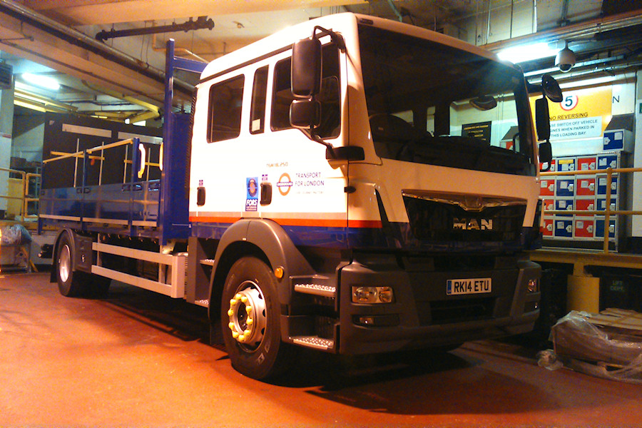 | Details: After a gap of over 2 years, some new full-sized lorries were delivered in August 2014. Two have so far been reported, both MAN TGM 18.250 dropside lorries similar to the pair delivered in 2012 (RV12OEY and RV12OEZ). Differences include LUL livery (with the silver safety stripe above the red stripe), a slightly re-designed front end, a short dropside door for crew access and (on RK14ETU at least) a much larger than normal tail-lift. The lifts and escalators section has always specified large tail-lifts and RK14ETU has been allocated to Griffith House (where it was photographed in the early hours of 22nd August) as a replacement for Iveco 2585I. The other addition (RK14ETT) has been noted at Acton Works and could be a replacement for MAN 2579. | ||||