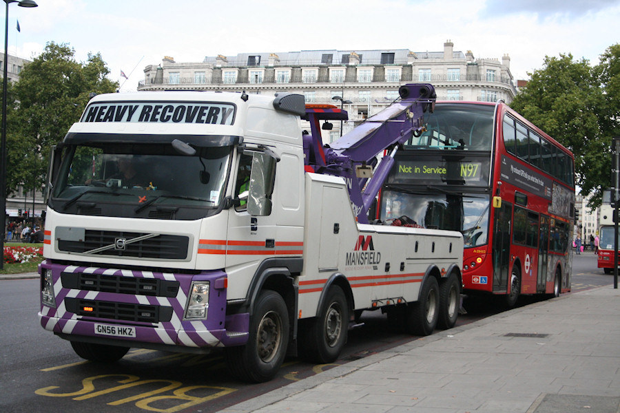 | Details: Mansfield looks set to become a more common name on London bus recovery work, following their takeover of SRE Recovery and On-time. The purple boom on Volvo truck GN56HKZ shows that it came from the latter company. It was photographed at Marble Arch on 22nd August 2014 preparing to tow a London United Enviro 400 hybrid with a somewhat unusual side advert. The bus had apparently been deposited here earlier by a different tow truck. This would account for the sight of a night-route blinded bus on the road in the early afternoon. The following day I noted this truck rescuing a London United Scania bus in Tolworth. | ||