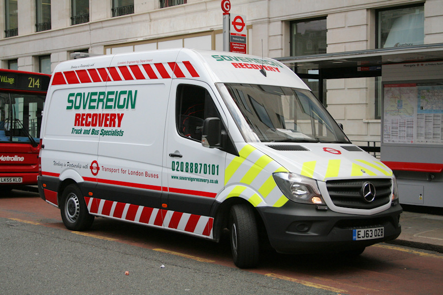 | Details: Although there appear to be fewer Sovereign Recovery tow trucks at work in London recently, their fleet of vans keeps growing. EJ63OZB is one of a pair of Mercedes-Benz Sprinter 313 vans new in early 2014. This one was not reported until Malcolm found it parked at Finsbury Square on 22nd August 2014. The Sprinter model had some frontal restyling in 2013/2014 with a reshaped and deeper grille. | |||