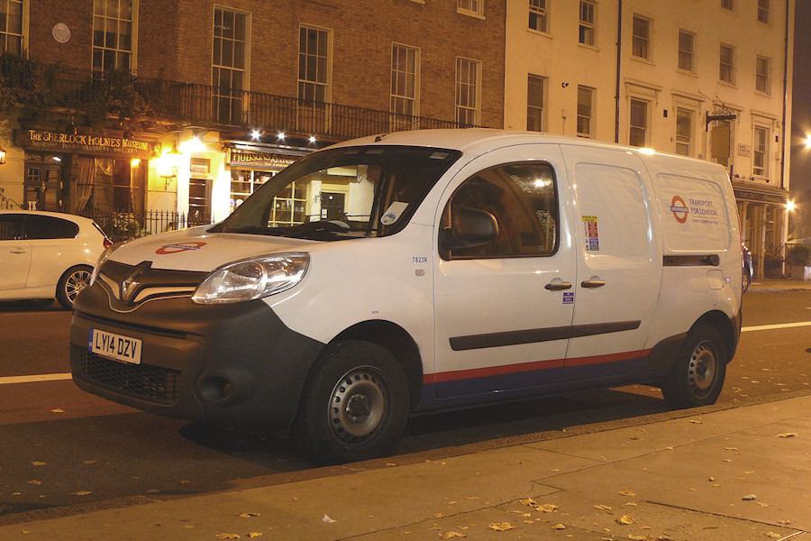 | Details: The Sherlock Holmes Museum in the background provides the clue that this is Baker Street, photographed at 1:30am on 4th September 2014. Renault Kangoo Maxi van 7823R was new in July and carries the recently revised standard LUL livery. | ||||
