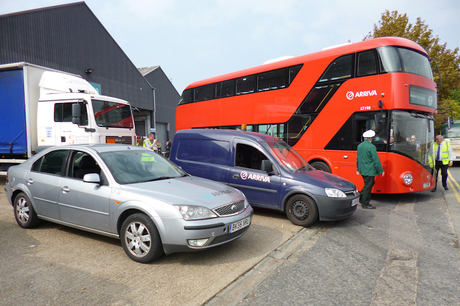| Details: The 'Year of the Bus' saw several garage open days take place, the last being at Dartford on 7th September 2014. This photo taken at the front of the garage shows two ferry vehicles parked up, while visiting New Routemaster LT198 departs to undertake a local tour. Nearest the camera is Ford Mondeo saloon BK56XRU, originally used from Grays garage and now carrying its fleetnumber CF26. The dark blue Vauxhall Combo van is allocated number VF403 bus this was not carried. It did have traces of its former TGM lettering, along with a roof beacon light (suggesting air-side use at Heathrow perhaps). By taking a ride through the bus wash, a few other service vehicles were noted, including several dumped Vauxhall Combo vans and two LDV Convoy minibuses still in TGM livery. | |||||