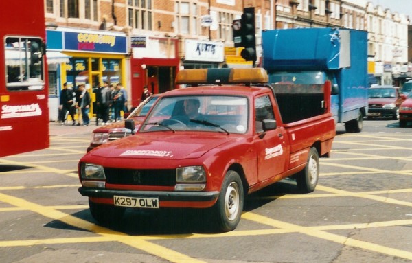 | Details: A total of 25 Peugeot 504s were taken into the leased fleet between 1987 and 1993. Most were pick-ups used as engineering run-abouts by bus garages. The last batch, received in 1993, were all allocated to garages in East London, and passed to the bus company of the same name upon privatisation. When photographed at East Ham on 5th May 2000, 4208P (K297OLW) had lost its fleetnumber and gained Stagecoach logos. The use of a tail-lift on vehicles of this size is most unusual. | ||||