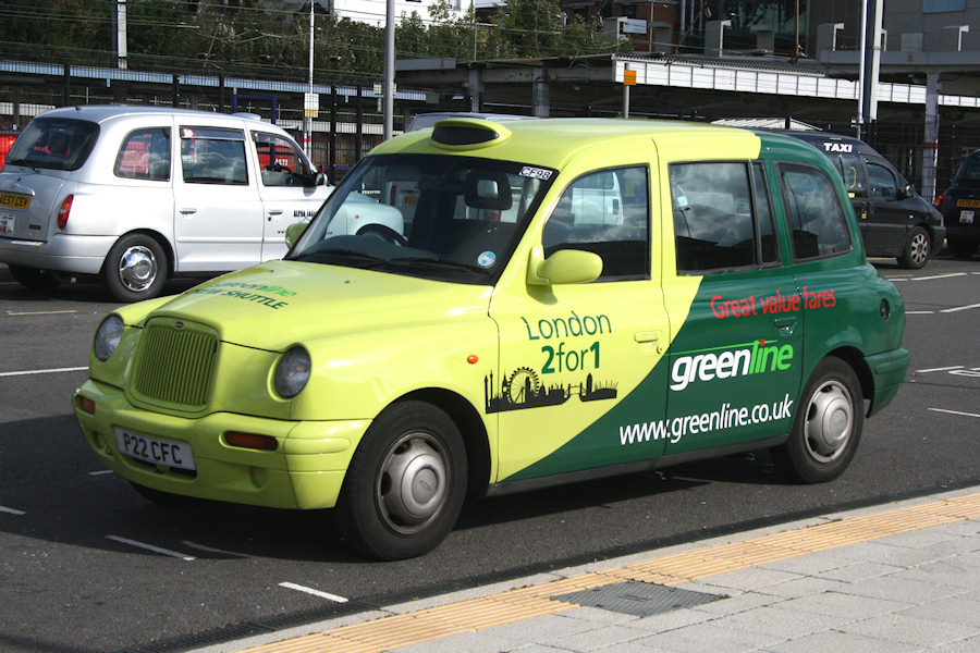 | Details: Arriva Shires has acquired many second-hand London taxis since 2012 for use as crew ferry vehicles. Initially Carbodies FX4s were used, but a growing number of the newer London Taxicabs International (LTI) TX1 model have also appeared. Numbered from CF73 upwards, additions in 2014 have seen the series reach CF105. Most have been reliveried in Arriva corporate colours, or as Green Line adverts. The latter scheme was changed during 2014. Initially featuring blue and green base colours, it is now two-tone green, as seen on CF98 (P22CFC) at Luton Station on 7th October 2014. The registration is probably not its first, P-prefix plates being used from 1st August 1996 until 31st July 1997. This vehicle was first registered in December 1997. | |||