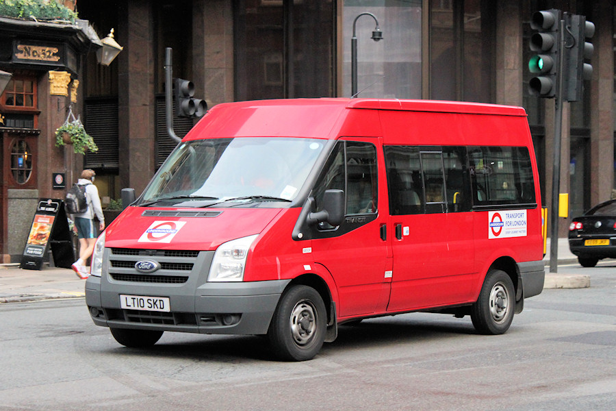 | Details: Ford Transit minibus 6853F is one of a pair that transferred to London Underground use following their replacement in the London Buses Passenger Data fleet in August 2014. As can be seen in this view of it passing the TfL offices on Victoria Street on 2nd November 2014, the orange squares have been removed and appropriate labels added. | |||