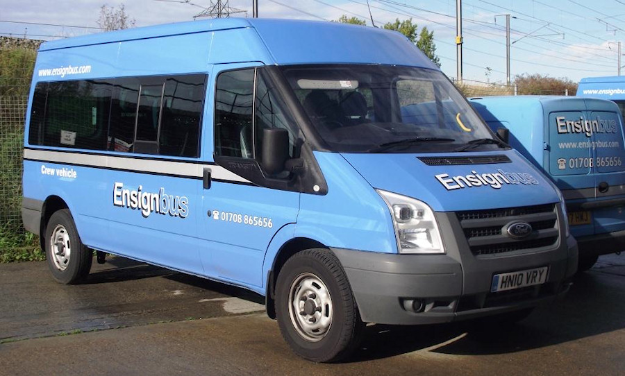 | Details: Ensignbus added at least two Ford Transit minibuses to their fleet in 2014, including HN10VRY photographed at the Purfleet base on a bright 11th October 2014. As with HN10VRX, this is a long-wheelbase Mk7. There may be a third, since the vehicle visible in the background (beyond Vauxhall Combo van DN07HWJ) has the company website address in a slightly different position to that on HN10VRX. | ||||