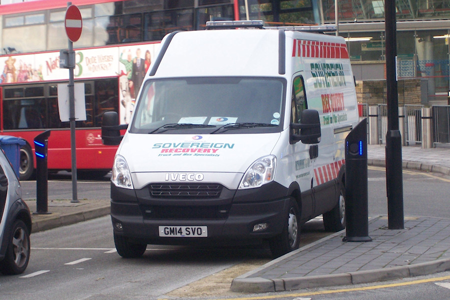 | Details: Sovereign Recovery has added vans from both Mercedes-Benz and Iveco recently. Photographed at Stratford Bus Station on 8th November 2014 was their GM14SVO, an Iveco Daily 35S15 high-roof van. Compared to slightly older HK63OOY, the layout of the lettering and red stripes has been subtly changed and the yellow stripes around the front have been omitted. Interestingly, this van also carries the Stagecoach logo and name, both on the bonnet and in the windscreen. Note that there appear to be two charging points for electric vehicles here, although no electric service vehicles have been reported here since EU61CRZ left in 2013. | ||||