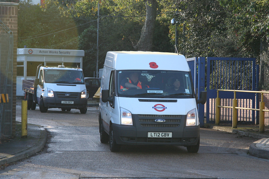 | Details: Guess who? With headlights on and a poppy on the front, Ford Transit van 7319F was leaving Acton Works when photographed on 12th November 2014. The position of the gutter shows that this is a short-wheelbase, mid-height example, quite rare in the central fleet but favoured by the Go-Ahead group. Following behind is lifts and escalators Ford Transit dropside 7218F with its Tube Lines logos and miniscule light-bar. | ||||