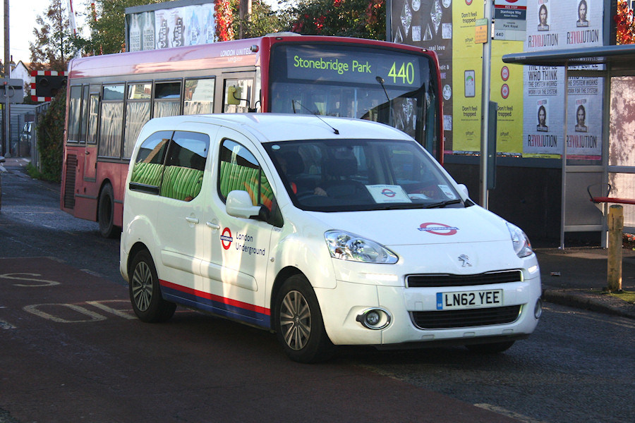 | Details: Peugeot Partner Tepee car 7491P is quite a common sight around Acton works, and was photographed nearby on 12th November 2014. Note that the strips of lights below the headlights are on, and that an Emergency Response sign is displayed in the windscreen (as seen earlier on similar 7336P). | |||