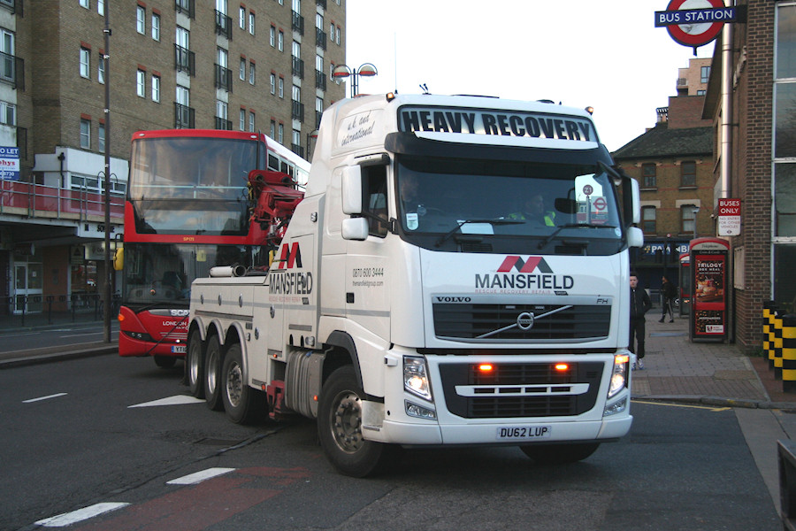 | Details: The Mansfield Group seems to be undertaking an increasing amount of bus recovery work in London. On 3rd December 2014 Derek caught this impressive 4-axle Volvo FH truck making the turn into Hounslow Bus Garage with London United SP175 on tow. | |||