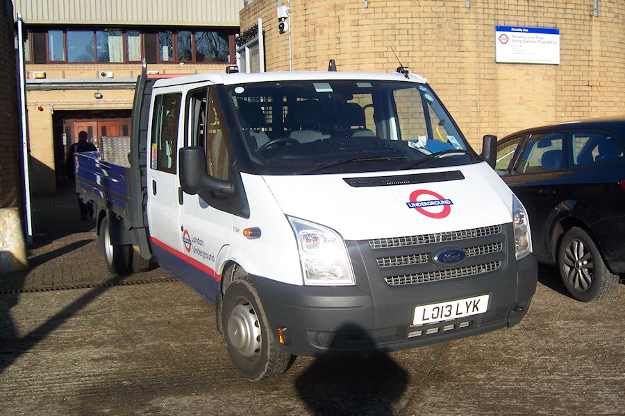 | Details: 7756F is a Ford Transit dropside truck new in Autumn 2013 but only reported a handful of times. It was found paying a visit to the erstwhile Track and Signals Operations Centre at Museum Way (Acton Town) on 19th January 2015. The sign here has recently been amended to read 'Piccadilly Line Track, Ealing Common Track Office'. Once again, the low sun has caused a little trouble for Ray. | ||||