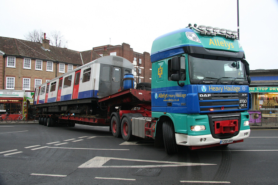 | Details: An interesting photograph taken at Acton Town Station on 21st January 2015 shows Allelys DAF XF tractor unit T200AHH moving D-stock car 7065 across the junction. Although it may appear as though it had come up Bollo Lane, as the tyre tracks show, this was not the case. It had in fact reversed down Museum Way, the train having presumably been loaded in the rear yard of the museum depot. The select registration T200AHH disguises the fact that this DAF was new in 2009. Now that all the A and C stock trains have been withdrawn, deliveries of new S stock are replacing the relatively young D stock on the District Line. An interesting plan being considered is to fit diesel engines to the redundant trains and use them to replace Pacer units on regional railway services. It amazes me that moving railway stock by road is now considered the norm, not just for LUL stock but also for former BR locos and coaches. | ||
