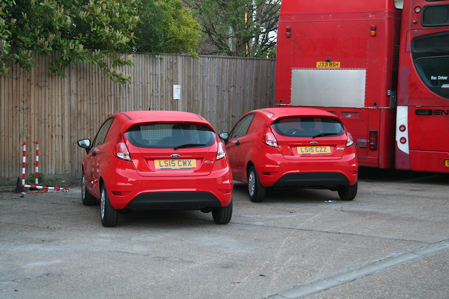 | Details: Somewhat unexpected was the delivery of several new service vehicles for London United in April 2015. London United has a youthful fleet, two large batches of vans having been acquired in 2012. Six unmarked red vans have so far been reported at the non-operational Twickenham Garage, including four Ford Fiestas and two Transit Customs. On 22nd April 2015, Ford Fiesta vans LS15CWX and LS15CZZ were seen. These vans appear identical to the Fiestas from 2012. In the background is Leyland Olympian bus J331BSH, latterly in the London Tour fleet recently acquired from Arriva. How the Enviro 400 bus alongside managed to park so close (given the size of the mirrors and the fact that the driver would have to get out) is a mystery! | |||||