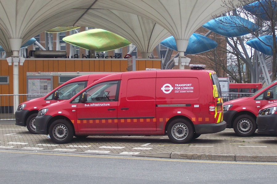 | Details: Stratford Bus Station is a good place to see LBSL Infrastructure vehicles, with 4 VW Caddy Maxi vans being visible on 20th March 2015. The focus is on 7897VW, with 7893VW behind it and 7902VW and 7895VW on the right. | ||||