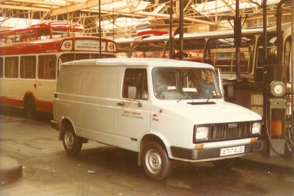 | Details: Sherpa vans, badged as Freight Rovers, were used by the cleaning services department in the early 1980s. 3159L (A717AJB), seen on the fuelling bay at Victoria garage on 14th April 1984, was allocated to nearby Grosvenor Gardens. In the background is Leyland National mobile shop 1234L, and a Green Line RB coach. | ||||