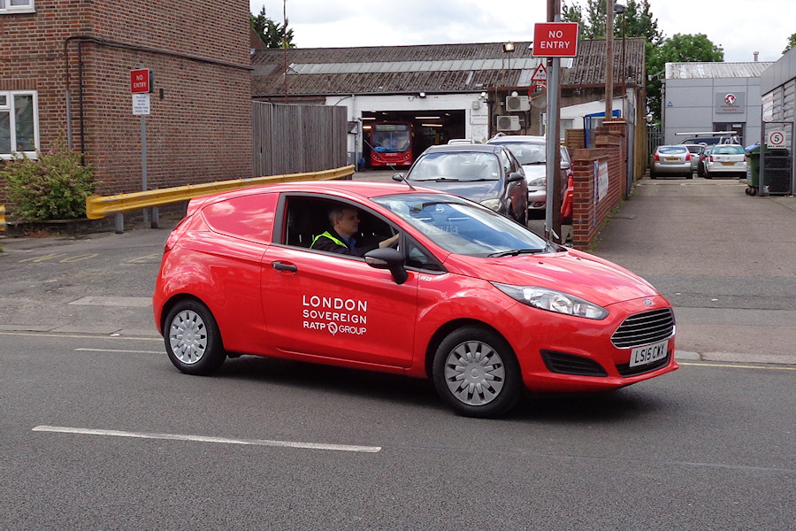 | Details: The four Ford Fiesta vans delivered to London United's Twickenham Garage in April 2015 did not enter service until late May, when they were allocated to the former Transdev/London Sovereign garages at Harrow and Edgware. With suitable lettering, and fleetnumber FF23, LS15CWX was caught leaving Harrow garage on 1st June 2015. This location became a bus garage in 1990 when it was bought from Venture coaches, although it has been through various owners since then. As can be seen, it is one of very few 'red' bus garages that are unable to accommodate double-deckers. | ||||