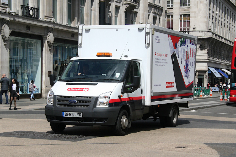 | Details: The sponsorship of the London cycle hire scheme was changed in April 2015 from Barclays to Santander. This has resulted in the blue-based markings on the support vehicles (and also all of the bicycles themselves) being changed to red. Re-liveried Ford Transit bike-carrying box truck BF63LYR was seen crossing Oxford Circus on 3rd June 2015 and can be compared to similar BN12AEY in original livery. | ||