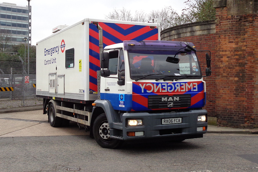 | Details: A crucial but rarely used service vehicle is the LUL Emergency Control Unit, kept at Acton Works and appearing only during major incidents or events. As such, the vehicles can last a long time. From 1991 until 2006, Mercedes-Benz lorry 2488M was the nominated chassis, fitted with demountable body DB7. The body was replaced by DB25 in 2006 but 2488M soldiered on until 2014 (by which time it was 23 years old). It was then replaced by MAN LE chassis 2587, which had been in general use since delivery in 2006. The lorry had red/blue chevrons and emergency lettering added to its front, and it may have had its fold-under tail-lift removed. The elusive vehicle was caught leaving Acton Works on 25th February 2016, a month short of its tenth birthday. | |||||