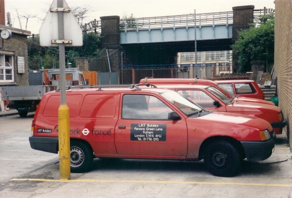| Details: A new style Vauxhall Astra was introduced in about 1986, with more curvaceous lines than its predecessor. This picture taken at Chiswick Works on 4th May 1987 shows an early example of the van version in the form of 3366B (C874FME). Behind are two old style Astra Estates with a Ford Escort van in between. The work force lettering is notable as is the lack of fleetnumber. 3366B was later transferred to Bexleyheath and repainted cream to support the Bexleybus operation. | ||||