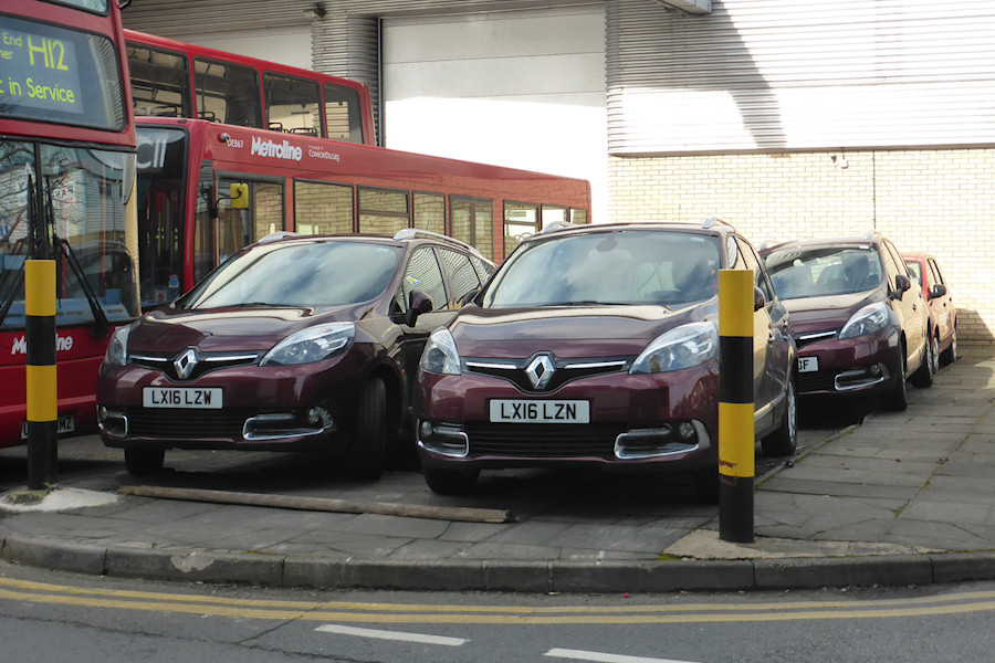 | Details: Each March and September our devoted Acton-watchers are camped out (not literally I trust) in the hope of catching the first of a new registration year. In 2016 the pioneers were not central fleet vehicles but these Renault Grand Scenic cars for Metroline. Four were found parked outside the CELF works in Perivale on 3rd March, with LX16LZW/LZN to the fore and LX16LZJ/MBF behind. The red car at the back is believed to be Nissan Note BW11MWX. A fortnight later LX16LZW and LZN were in use at Holloway garage, still in unmarked maroon. | |||||