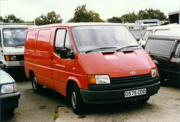 | Details: 3383F (D575CDD) was an early example of the Mark 3 Ford Transit van, delivered in 1986 and allocated to Chiswick, then Acton, prior to its withdrawal in 1990. In this view taken at Chiswick works on 13th August 1988, it will be noted that the London Transport lettering has been removed, although the subtitle Distribution Services remains. Unfortunately it is not known if the black Ford Escort van alongside was also a service vehicle. | ||||