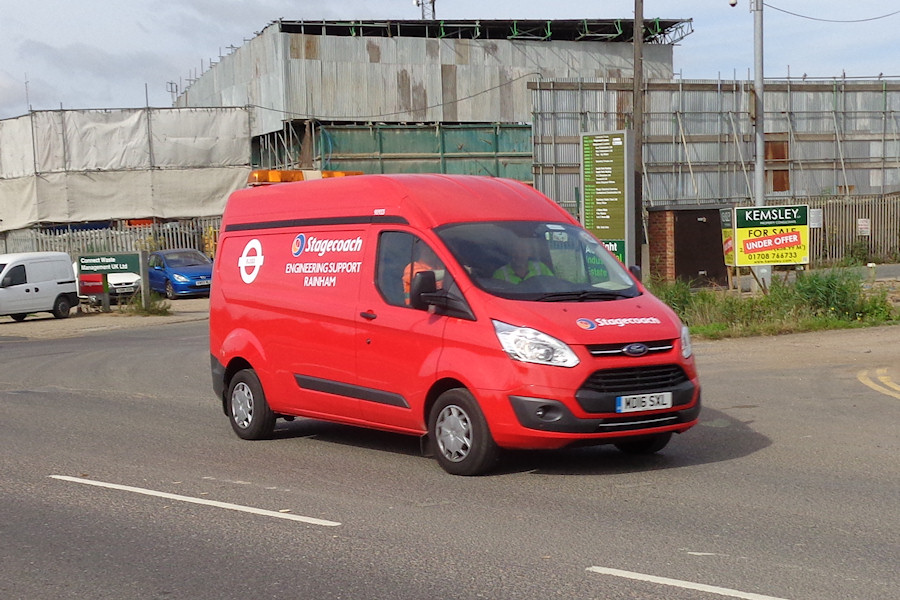 | Details: Another new Ford Transit Custom van for Stagecoach London is MD16SXL, lettered for use as the Rainham Garage Engineering Support vehicle. It also has a fleetnumber above the driver's door, which appears to be 90933. On 25th July 2016 Ray caught the new van on Ferry Lane, close to the garage. A new van has also been seen at Catford (not yet identified) while more should be expected at Barking, Bow, Leyton and North Street. | |||