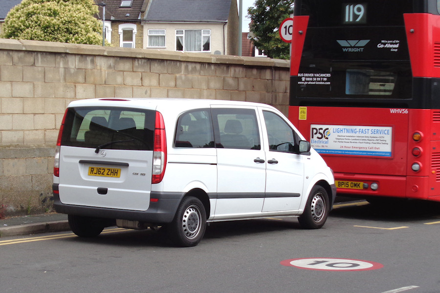 | Details: Ray and I had a bit of an argument over whether or not this vehicle currently had any markings! Fortunately photographic contributions have settled the matter. Mercedes-Benz Vito minibus RJ62ZHH has the Metrobus logo and fleetnumber 8063 on the front (and possibly nearside), while the rear and offside are plain white. It certainly had markings all round when new in 2013. The Go-Ahead crew ferry fleet has seen big changes recently, with lots of vehicles moving from east London garages to Orpington. Photographed at Bromley North Station on 14th August 2016. | |||