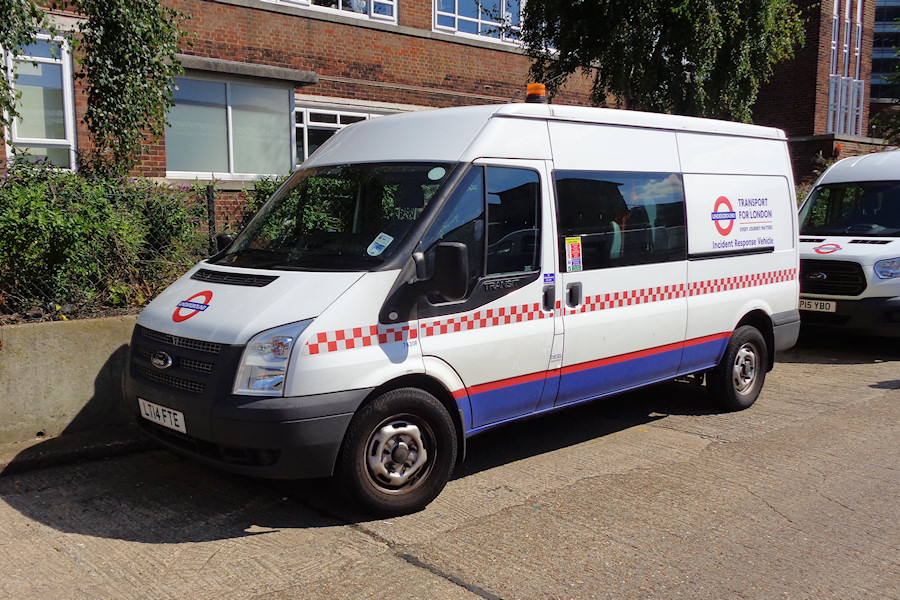| Details: The programme to apply Incident Response Vehicle markings to various service vehicles from early-2016 affected mainly cars. An exception was Ford Transit crew van 7820F, which looks good in its new guise at Acton Works on 30th August 2016. | ||||