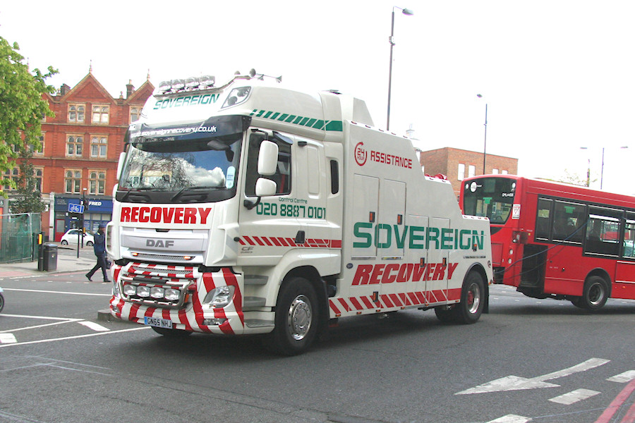 | Details: At present the newest big vehicles in the Sovereign Recovery fleet are a pair of DAF CF510 units new in early 2016. They are slightly unusual in being only 2-axle and for having very tall bodywork. On 27th April 2016 Derek captured GN65NHJ at Camberwell with a Tower Transit Enviro 200 bus on tow. | |||