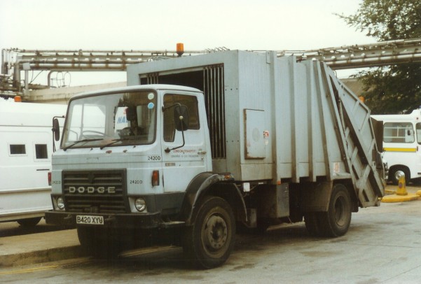 | Details: 2420D (B420XYU), photographed at Acton works on 30th May 1990, was one of three Dodge Commando G16 refuse trucks bought in 1985. Items to note include the fleetnumber being carried on either side of the radiator grille as well as in the traditional corner locations, and the rather vulnerable flashing light on the roof. Compared to an earlier picture of similar 2419D, 2420D does not appear to carry a spare wheel. | ||||