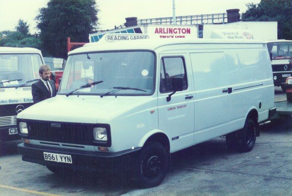 | Details: 2422L (B561YYN) was an early example of the larger Sherpa 350 van, taken into stock in April 1985 and photographed at the Chiswick Works open day four months later. The vehicle was fitted with a tow bar (seen here with a car-carrying trailer attached) and unusually featured white lettering on its grey livery. Withdrawn in 1990, it was later resuscitated and used as a service vehicle recovery truck in white and blue livery with roof-mounted light bar, as seen here. | ||||