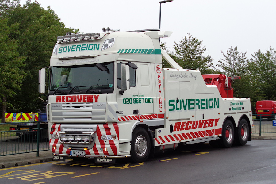 | Details: The NxSOV registration numbers held by Sovereign Recovery have appeared on several vehicles. N10SOV was first noted on a DAF CF recovery truck in 2009, then on a Volkswagen Transporter van during 2011. It now adorns this DAF XF recovery truck new in 2010. On 29th September 2016 it was at Addington Village Interchange keeping company with members of two other service vehicle fleets. On the left is central fleet Ford Transit 7627F in Tramlink livery, while on the right is Go-Ahead London Vauxhall Combo van HN13YMZ. | |||