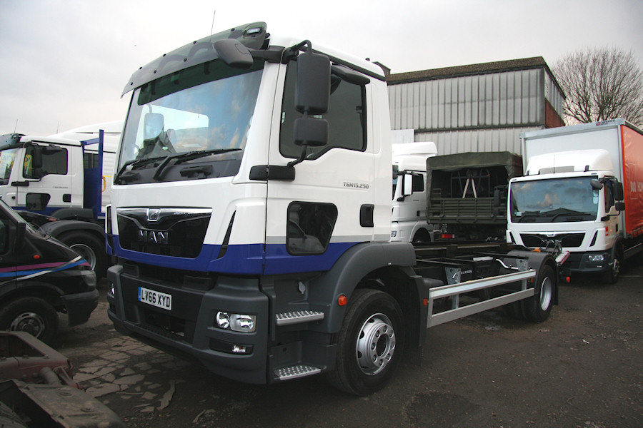 | Details: MAN lorry LV66XYD was photographed in the dealer's yard in Bedfont on 20th December 2016. It is a TGM 15.250 and it features runners atop the chassis that suggest it could be a demountable lorry. Having said that, it could yet be fitted with a permanent body. LV66XYC is just visible on the left and looks to be very similar but based on a TGM 16.250 (or 18.250) chassis. | |||