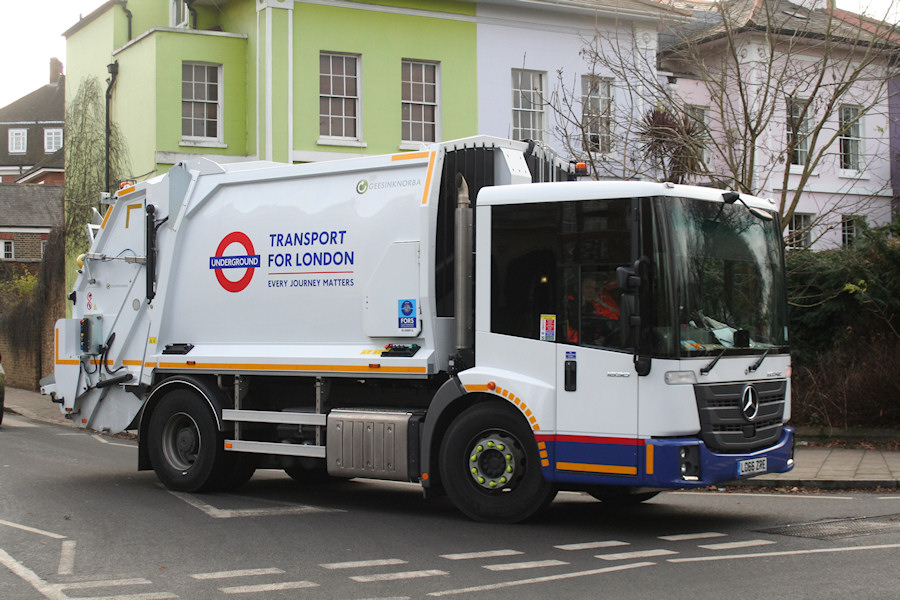 | Details: The two new MAN lorries illustrated last month were delivered to Acton Works shortly after Christmas 2016 but have yet to be photographed. What has been sent in is this excellent photo of a new Mercedes Econic dustcart. LO66ZRE was new in December and has a 2-axle chassis and Geesink Norba bodywork. As such it may be a belated replacement for 2-axle WX08KUT which was sold in mid-2016. The new lorry was caught in Chiswick on 4th January 2017. | |||